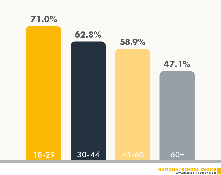 - Parents aged 18 to 29 were more likely to search for new schools (71%), compared to 63% of parents aged 30 to 44, 59% of parents aged 45 to 60, and 47% of parents over the age of 60.