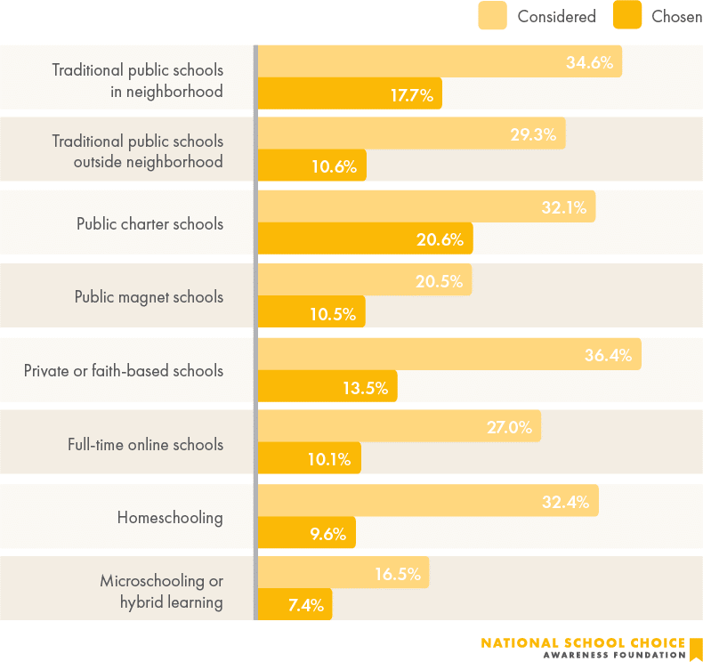 28% of parents who searched for or considered new schools for their children ultimately enrolled their children in different schools. Of these parents, 60% selected public-sector schools, 10% selected full-time online schools (of which some are public and some are private), and 30% selected either private schools, homeschooling, or microschooling.
