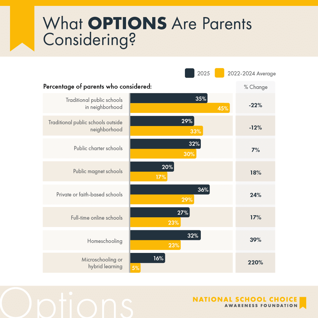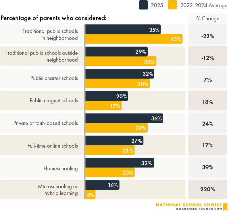 Parents who searched for new schools for their children expressed a willingness to consider a variety of different types of schools. While interest in public-sector education remained strong, school-switching parents in our 2025 survey appeared less likely to consider public schools in their neighborhoods than they were in previous years’ surveys, but more likely to consider private schools, homeschooling, and microschools.