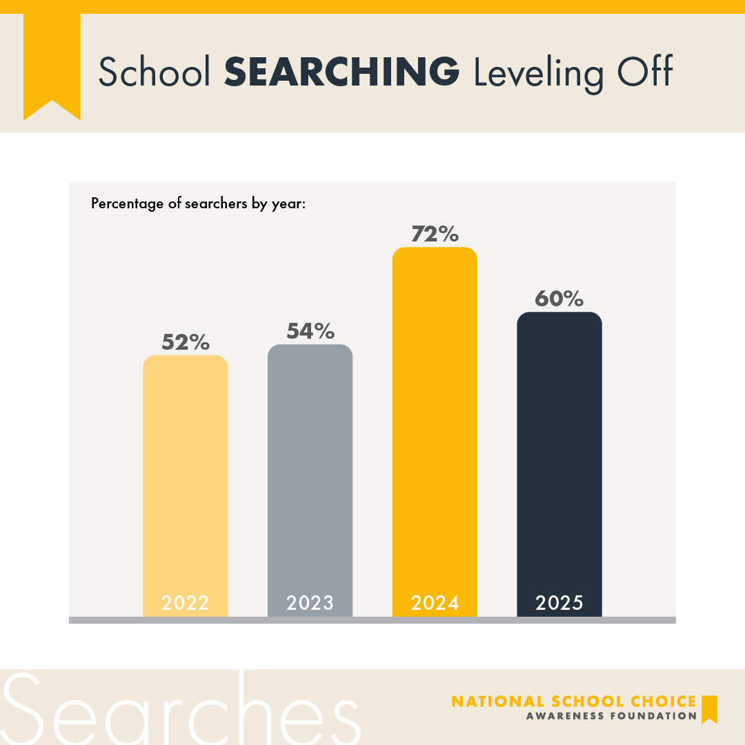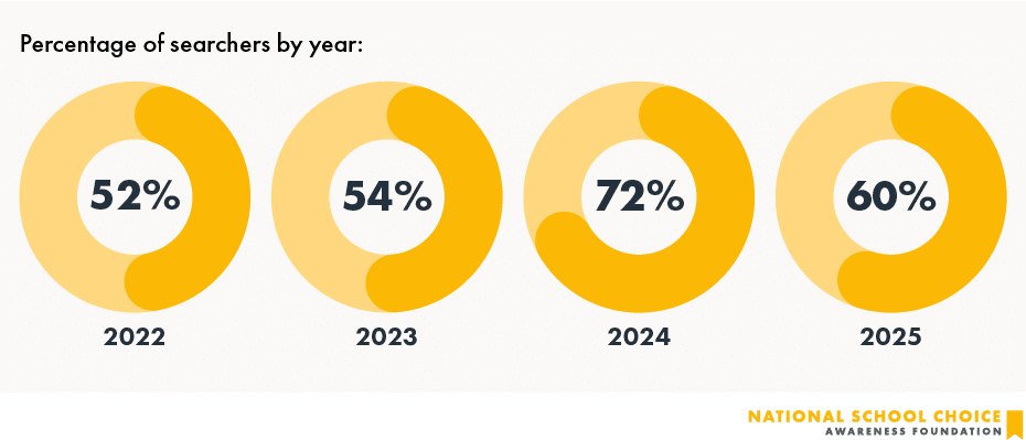 Nationwide, the percentage of parents who searched for new schools for their children last year declined over our January 2024 survey (72%), reflecting an expected “leveling-off” of school searching after the COVID-19 pandemic era. However, the percentage of parents who searched for schools last year remained higher than in our January 2023 (54%) and January 2022 (52%) surveys.