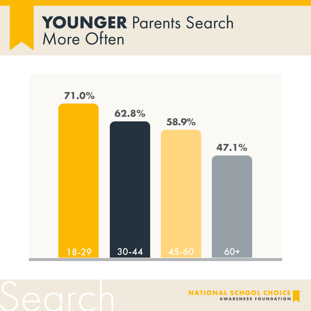 - Parents aged 18 to 29 were more likely to search for new schools (71%), compared to 63% of parents aged 30 to 44, 59% of parents aged 45 to 60, and 47% of parents over the age of 60.